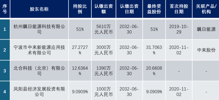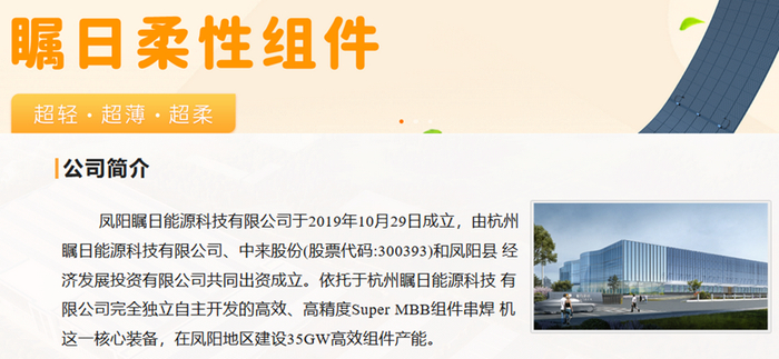 瞩日能源官网显示:公司于2019年10月29日成立,由杭州瞩日能源科技有限公司、中来股份和凤阳县经济发展投资有限公司共同出资成立。依托于杭州瞩日能源科技有限公司完全独立自主开发的高效、高精度Super MBB组件串焊机这一核心装备,在凤阳地区建设35GW高效组件产能。