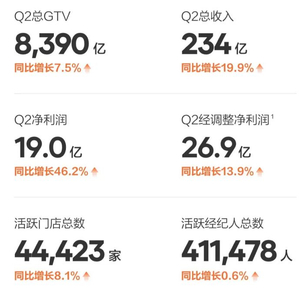贝壳2024年第二季度总交易额(GTV)8390亿元,净收入为234亿元,同比增长19.9%,毛利率为27.9%,净利润达19亿元,同比增长46.2%,经调整净利润达26.9亿元,同比增长13.9%。