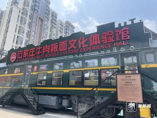 河北省山东商会副会长申培同把石家庄牛肉板面文化体验馆开到了“内燃机车”里。步入车厢,驾驶室的位置标注着“板面专列”,显示屏上循环播放着铁轨的视频。“让顾客感觉就像坐在绿皮火车上吃板面。”申培同说,来馆里不仅可以吃板面,还可以购买乐事推出的石家庄专属牛肉板面口味薯片,顾客甚至可以上手自己摔出一碗板面。