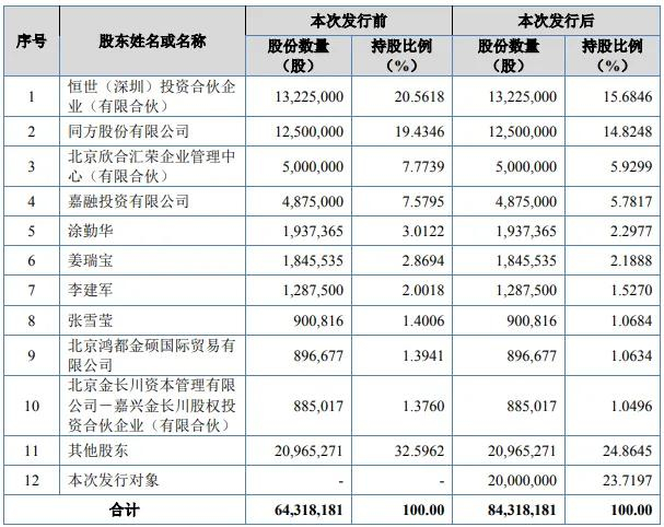 根据申报材料及公开信息,(1)公司无控股股东和实际控制人,公司直接持股5%以上股东分别为:恒世投资(持有公司20.5618%的股份)、同方股份(持有公司19.4346%的股份)、欣合汇荣(持有公司7.7739%的股份)、嘉融投资(持有公司7.5795%的股份)。