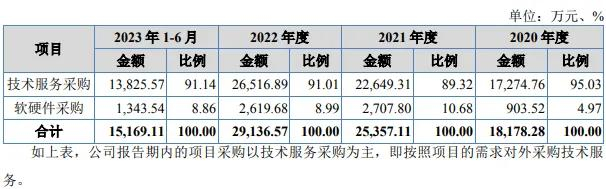 根据申报材料,发行人项目采购包括技术服务采购和软硬件采购,其中技术服务采购金额分别为1.73亿元、2.26亿元、2.65亿元和1.38亿元,占采购总额的比例分别为95.03%、89.32%、91.01%和91.14%。外采技术服务占主营业务成本的比例分别为41.06%、44.26%、45.95%和46.98%,报告期内占比不断升高。报告期内,发行人前五大供应商变动较大。