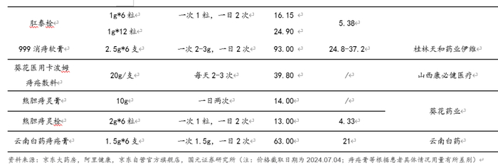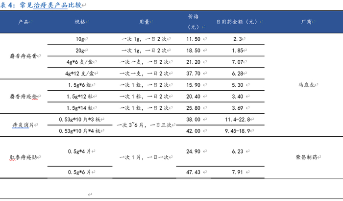 价格低廉优势显著。马应龙治痔类产品价格低廉、性价比高等特质不断吸引消费者,让顾客粘性增加。目前市场上畅销的治痔类产品有马应龙麝香痔疮膏、麝香痔疮栓、痔炎消片、肛泰痔疮贴、999消痔软膏等。在同类产品中,马应龙治痔类产品价格优势明显,日用药金额相对较低。较低的日用药金额与较为稳定的价格体系为产品未来提供了一定的涨价空间。