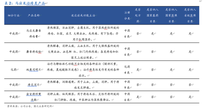 公司坚持传承老字号的中医药配方,在八宝名方(麝香、牛黄、琥珀、珍珠、冰片、炉甘石、硼砂、硇砂等八味中药)的基础上,陆续研制推出了马应龙麝香痔疮膏、麝香痔疮栓等深受用户好评的产品。公司生产的五项治痔类产品(马应龙麝香痔疮膏、麝香痔疮栓、地奥司明片、痔炎消片、金玄痔科熏洗散),涵盖内服和外用多种规模的产品,其中有三项产品被纳入国家医保目录、四项被纳入省级医保目录。