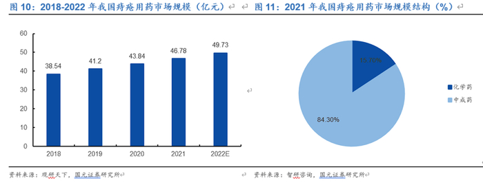 痔疮是一种常见的肛肠疾病,发病率高、难以根治,痔疮用药市场潜力巨大。民间流传有“十人九痔”的说法。根据2016年发表的《中国城市居民常见肛肠疾病流行病学调查》文章显示,患有肛肠疾病的成年人占总调查人群的51.14%,其中痔疮的发病率最高,达到50.28%;痔疮的患病率随年龄增加而升高,尤其是在25至64岁的年龄段。痔疮的具体成因尚不明确,但某些增加腹腔压力的因素,如便秘、腹泻、长时间如厕等,可能会提高痔疮的风险。此外,妊娠期间痔疮的发生率也较高。2018年到2022年期间,我国的痔疮用药市场规模逐年提升,从38.54亿元增加至49.73亿元,未来发展潜力巨大。