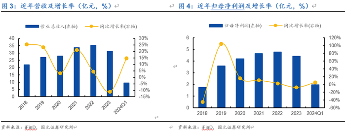 公司收入和利润一直保持稳健增长,公司2023年营收31.37亿元,同比下降11.20%;实现归母净利润4.43亿元,同比下降7.46%,收入和利润端出现下降主要与公司清理渠道库存有关,进入2024年一季度,公司业绩恢复增长,2024Q1实现收入9.55亿元,同比增长14.70%,实现归母净利润1.98亿元,同比增长5.36%。