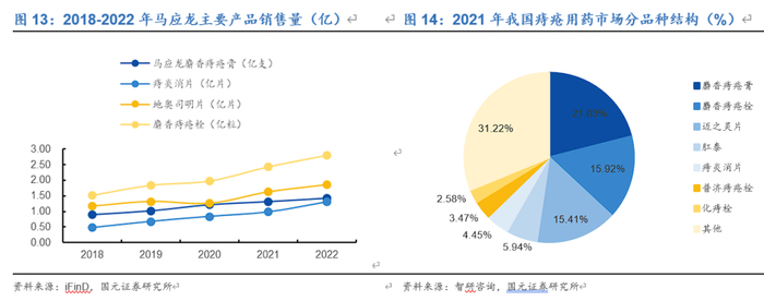 痔疮作为一种常见的肛肠疾病,具有发病率高、难以根治等特点。随着用药人群的增加,痔疮用药市场规模也在逐年提升,2021年痔疮中成药占痔疮用药市场规模的84.30%,痔疮中药制药市场前景广阔。公司主导产品马应龙麝香痔疮膏、麝香痔疮栓凭借品牌与价格优势,在市场上占据较大份额。同时公司积极优化渠道,清理库存,提升营运能力。公司也积极回归眼药本源,近年来,拓展发展眼部健康产业,大力发展眼部美妆和大健康业务。公司眼药的核心产品为马应龙八宝眼膏,皮肤品类以龙珠软膏为核心,深挖潜力,盘活存量资源,继续研发相关产品。逐步构建形成了以肛肠为核心,以眼科、皮肤等为支柱的产品格局。