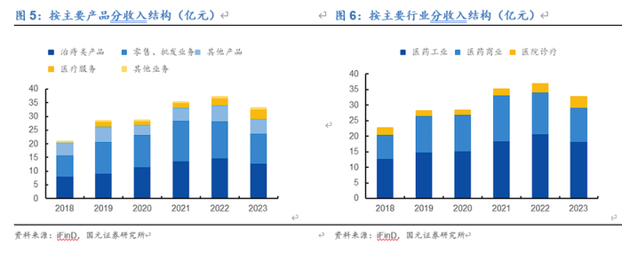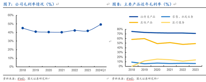 医药工业是目前公司最主要的收入来源,占比不断提升。同期公司零售、批发业务的收入规模不断扩大,收入从2018年的7.87亿元增长至2023年的10.88亿元。医疗服务的收入规模在近年来也不断增加,自2019年开始启动,收入从2019年的1.54亿元增加到2023年的3.45亿元。