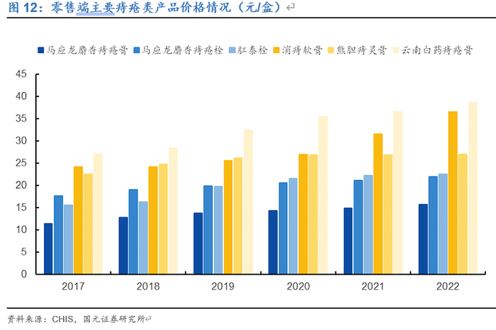 从终端零售价格来看,据中康开思数据显示,市场主流治疗痔疮的产品近几年均保持了持续的小幅涨价,马应龙痔疮膏(不分品规)2017年的平均零售价格为11.35元/盒,2022年的平均零售价格为15.66元/盒,年均复合增长率为6.65%。