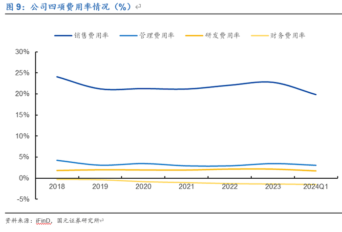 公司期间费用率整体保持平稳,2019年开始,销售费用率持续维持在22%左右,管理费用率维持在3%左右,研发费用率维持在2%左右,因为公司利息收入一直多于利息支出,财务费用率一直维持为负。