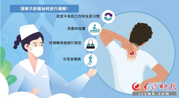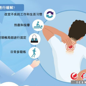 首先,改变不良的工作和生活习惯。不要长期低头伏案工作,长时间保持固定姿势,会导致神经肌肉的过度紧张,使颈椎更为不适。应注意定期改变头颈部姿势、定时远视,还可根据自身的身高和习惯,调整适合自己的工作台高度及倾斜度,使颈椎保持内外平衡;恰当的睡眠体位有助于缓解颈椎不适,睡眠时最好采取侧卧或仰卧位,枕头不宜过高,软硬适中、宽度适合;外界环境的风、寒、湿也可加重颈椎的不适,颈部保暖很重要,气温低、寒冷时建议戴围巾、戴脖套,穿高领毛衣、立领棉衣,避免用冷水长时间冲洗。