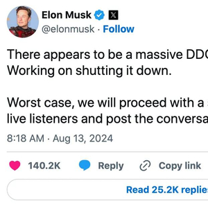 在备受关注的此次对话中,因X平台技术问题,导致许多用户在尝试访问时遭遇困难。马斯克表示:“X平台似乎遭到了大规模的DDOS网络攻击,我们正在努力阻止它。最坏的情况下,我们将在只有少量现场听众的情况下继续与特朗普的访谈,并在稍后发布对话内容。”