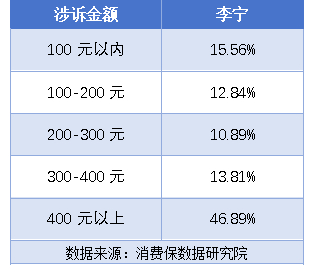 据消费保显示,李宁相关投诉金额分布如下表所示,李宁相关投诉涉诉金额主要在400元以上(占比46.89%)。