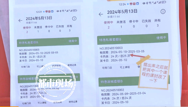 消费者 赵女士:当时说好的是有25次私教课和25次大器械课程,可是我事后在他的公众号小程序看到的两种课程都是只有24次课。而且是当时说好的两年的有效期,因为本身就是期限的问题来的,他承诺了会给我延期一年,可是我在系统里看到的又是一年都不到,我5月10日办卡,它显示明年的3月20几号就到期了,也就是说只有10个月有效期,我肯定是有疑问。