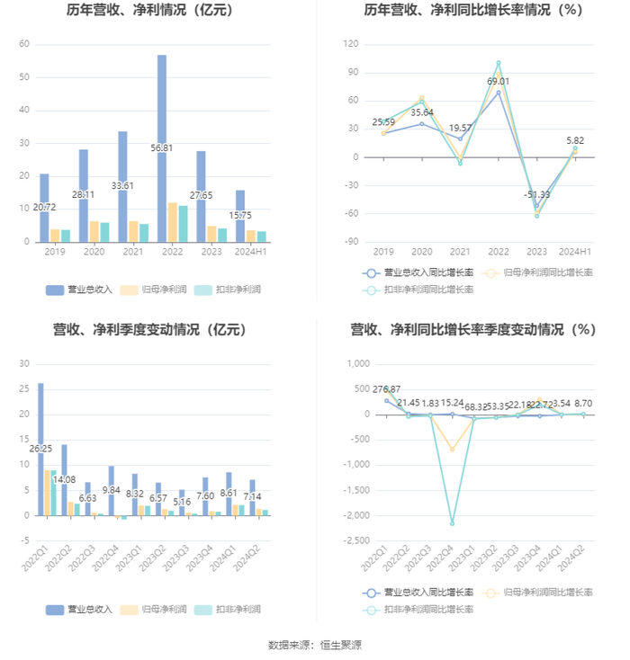 根据半年报,公司第二季度实现营业总收入7.14亿元,同比增长8.70%,环比下降17.06%;归母净利润1.37亿元,同比增长5.08%,环比下降37.04%;扣非净利润1.16亿元,同比增长16.06%,环比下降44.30%。