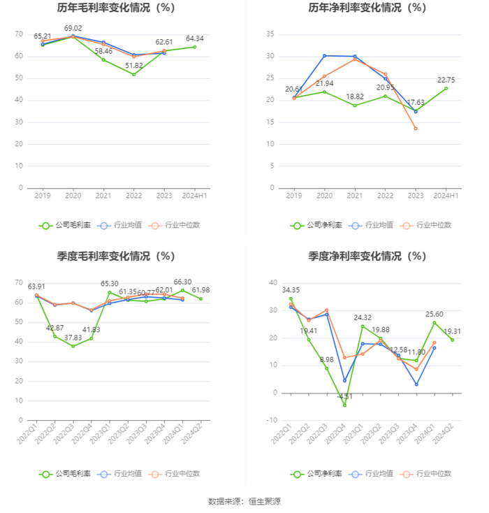 2024年上半年,公司毛利率为64.34%,同比上升0.79个百分点;净利率为22.75%,较上年同期上升0.39个百分点。从单季度指标来看,2024年第二季度公司毛利率为61.98%,同比上升0.63个百分点,环比下降4.32个百分点;净利率为19.31%,较上年同期下降0.57个百分点,较上一季度下降6.29个百分点。