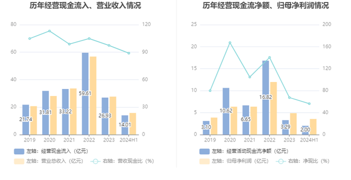 2024年上半年,公司营业收入现金比为88.95%,净现比为56.31%。