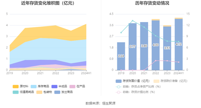 从存货变动来看,截至2024年上半年末,公司存货账面价值为4.12亿元,占净资产的7.67%,较上年末增加6098.86万元。其中,存货跌价准备为908.4万元,计提比例为2.16%。