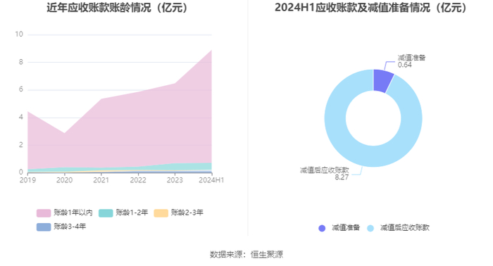 从应收账款账龄结构来看,截至2024年上半年末,公司账龄在1年以内的应收账款余额为8.18亿元,较上年末增长2.40亿元,占应收账款总额比例为91.87%,较上年末上升2.66个百分点。