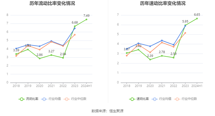 2024年上半年,公司流动比率为7.49,速动比率为6.65。