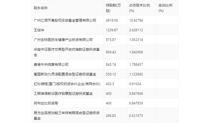 半年报显示,2024年上半年末的公司十大流通股东中,新进股东为红杉锦程(厦门)股权投资合伙企业(有限合伙)、工银瑞信前沿医疗股票型证券投资基金,取代了一季度末的李文美、中欧医疗健康混合型证券投资基金。在具体持股比例上,香港中央结算有限公司持股有所上升,广州汇垠天粤股权投资基金管理有限公司、王继华、广州生物医药与健康产业投资有限公司、华宝中证医疗交易型开放式指数证券投资基金、富国新动力灵活配置混合型证券投资基金、阿布达比投资局、易方达品质动能三年持有期混合型证券投资基金持股有所下降。