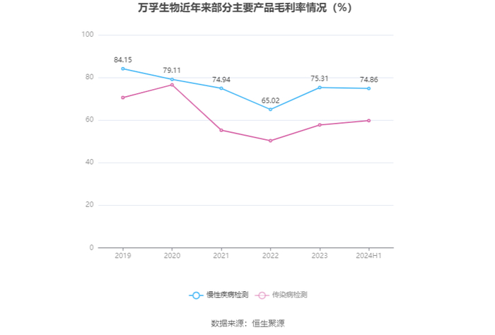 分产品看,慢性疾病检测、传染病检测2024年上半年毛利率分别为74.86%、59.75%。