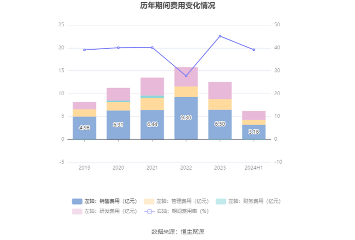 2024年上半年,公司期间费用为6.17亿元,较上年同期增加1830.42万元;但期间费用率为39.19%,较上年同期下降1.05个百分点。其中,销售费用同比增长0.95%,管理费用同比增长1.07%,研发费用同比增长3.45%,财务费用由去年同期的-1339.28万元变为-579.95万元。