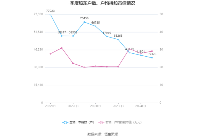 筹码集中度方面,截至2024年上半年末,公司股东总户数为3.93万户,较一季度末下降了2175户,降幅5.24%;户均持股市值由一季度末的27.98万元上升至29.27万元,增幅为4.61%。