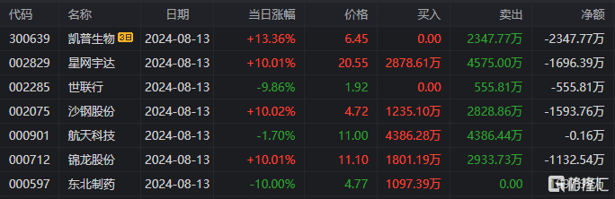 宁波桑田路:分别净买入星网宇达、锦龙股份3225.54万元、2071.2万元
