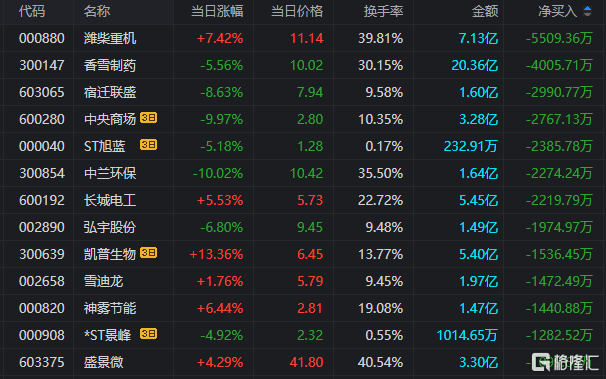 龙虎榜净卖出额前三为潍柴重机、香雪制药、宿迁联盛,分别为5509.36万元、4005.71万元、2990.77万元。