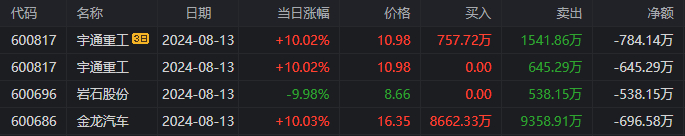 在龙虎榜中,涉及沪股通专用席位的个股有3只,金龙汽车的沪股通专用席位净卖出额最大,净卖出696.58万元。