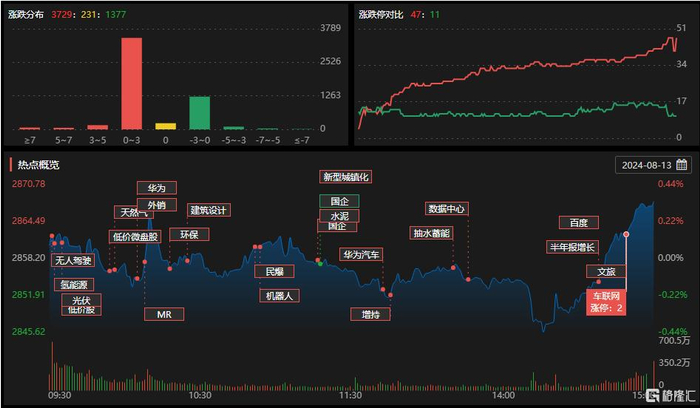 8月13日,A股市场涨多跌少,全市超3700只个股上涨,1399余只个股下跌,全天成交4773亿元。市场热点聚焦民爆概念、车联网、油气板块、消费电子等板块。