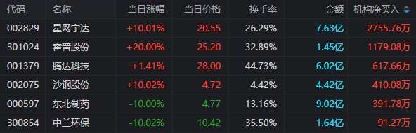龙虎榜中涉及机构专用席位的个股中,当日净买入额前三为星网宇达、霍普股份、腾达科技,分别为2755.76万元、1179.08万元、617.66万元。