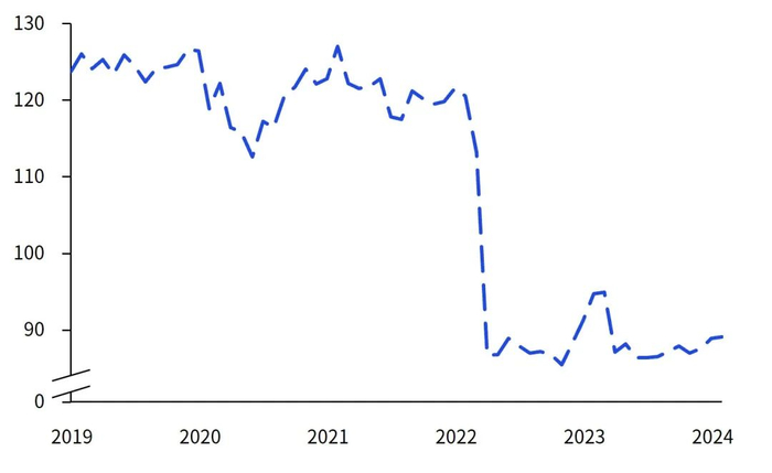 中国境内住户存款/中国名义GDP,2019-2023,%