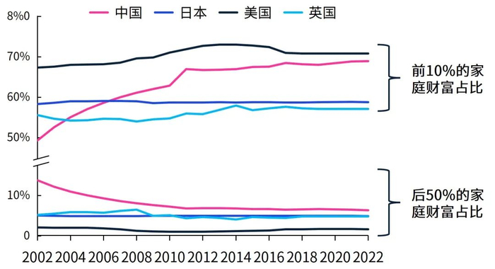 全球核心经济体家庭财富占比变化,2002-2022,%