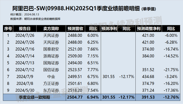 根据朝阳永续港股季度业绩前瞻数据,截至2024年8月13日,全市场共有8家券商共计9份研报,出具了针对阿里巴巴-SW(09988.HK)的2025财年第一季度业绩前瞻数据预测。