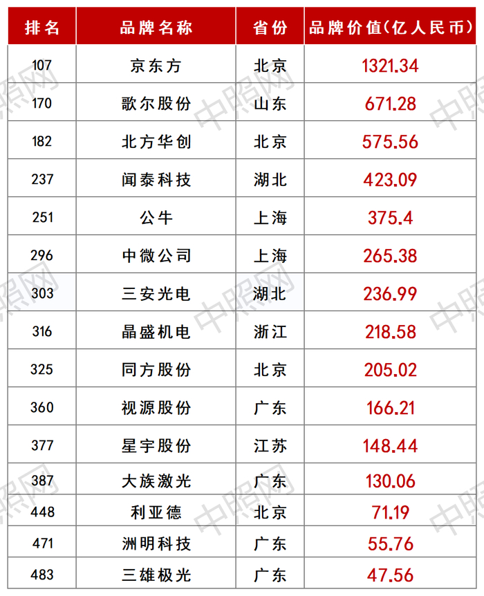 具体来看,京东方、歌尔股份、北方华创、闻泰科技、公牛、中微公司、三安光电、晶盛机电、同方股份、视源股份、星宇股份、大族激光、利亚德、洲明科技、三雄极光依次排名107、170、182、237、251、296、303、316、325、360、377、387、448、471、483。