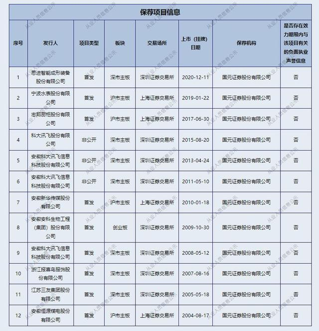 中国证券业协会公示的从业人员基本信息显示,王晨有两次登记记录,执业机构都是国元证券,第一次是2004年2月12日,登记类别是一般证券业务,2012年10月17日注销登记后,王晨于2012年10月19日再次登记,此次登记类别是保荐代表人,目前登记状态仍显示为“正常”。