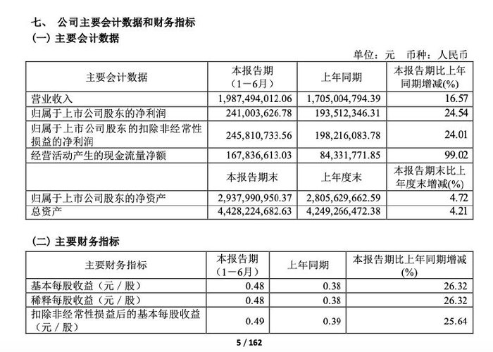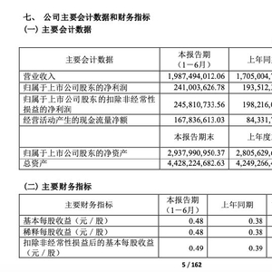 振华股份在半年报中透露,公司报告期实现营业收入19.87亿元,同比增长16.57%;归属于上市公司股东的净利润2.41亿元,同比增长24.54%;归属于上市公司股东的扣除非经常性损益的净利润2.46亿元,同比增长24.01%;基本每股收益0.48元。