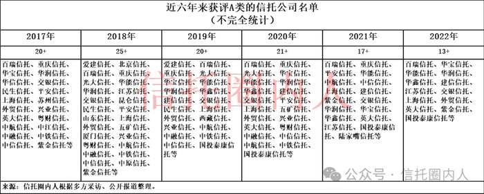此外,据信托圈内人不完全统计,2017-2022年近六年来获得信托业协会A评级的信托公司如下:
