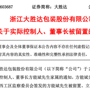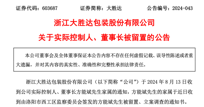 8月13日晚间,浙江包装业龙头大胜达(603687.SH)公告,公司于2024年8月13日收到公司实际控制人、董事长方能斌家属的通知,方能斌的家属于近日收到由洛阳市西工区监察委员会签发的方能斌先生被留置、立案调查的通知书。