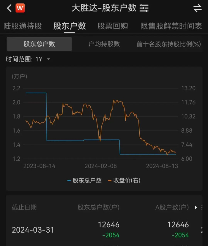 截至2024年3月31日,大胜达股东数为1.26万户。