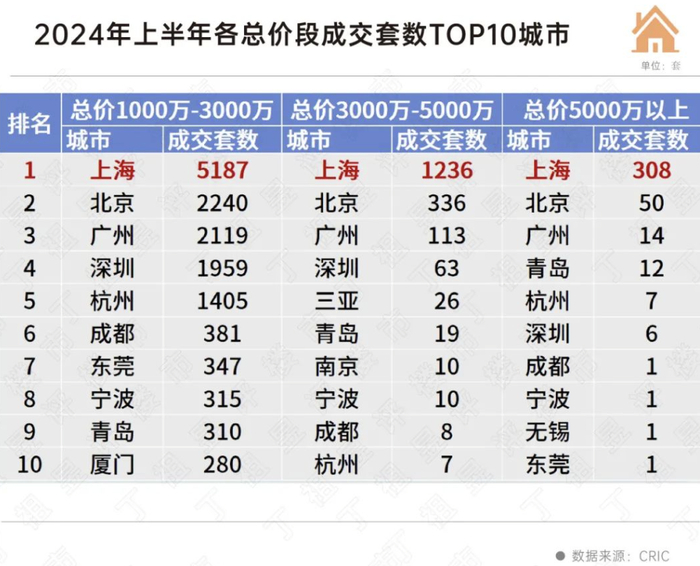具体来看,2024年上半年上海总价1000万-3000万高端住宅共成交5187套,同比下降32.4%,总价3000万-5000万成交套数为1236套,同比增192.6%,成交套数占统计城市的近七成。总价5000万元以上高端住宅共成交308套,同比增长422%,占比接近八成。