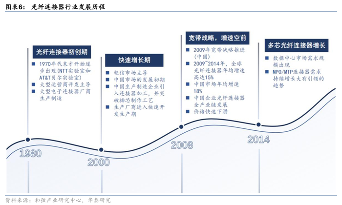 光纤连接器行业发展驱动力经历了由电信市场向数通市场的切换。根据和弦产业研究中心的梳理,全球光纤连接器行业的发展历程大致可以划分为四个阶段:1)1980~2000年为光纤连接器初创期,大型电信运营商参与生产开发,从1990年AT&T推出LC,到1992年NTT推出MPO,光纤连接器产品快速迭代、标准密集推出;2)2000~2008年,全球光纤连接器市场迎来快速增长期,电信运营商开始主导市场。国内厂商从技术模仿、代工到引入光纤连接器与插芯工艺,推动整条产业链发展;3)2008~2014年,国内宽带战略的推动下,我国光纤连接器市场进入高速成长周期;4)2014年至今,数据中心市场逐步取代电信市场,成为光纤连接器行业发展的核心驱动力,因适应于数通场景的高速传输需求,以MPO连接器为主流方向的行业演进路线逐步明确。