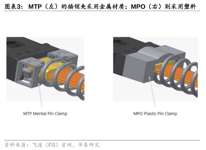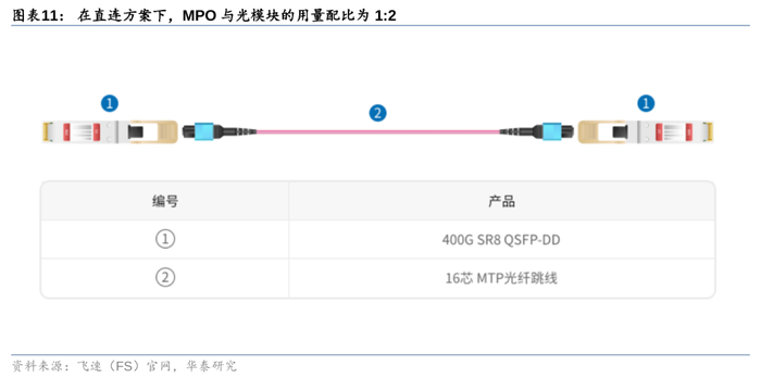 ①市场认为单模光模块不需要匹配MPO,我们认为单模光模块同样会带动MPO需求的提升。光模块侧接口类型通常与光模块的传输模式有关,按照传输模式,光模块可分为并行和波分两种类型,其中并行方案在中短距传输场景中成本优势较为明显,采用MPO接口。以800G光模块为例,多模的SR8与单模的DR8型号均为并行方案,故常采用MPO接口;而在长距离传输场景中,波分方案可较为明显地节约光纤成本而更为常用,采用LC/SC等接口,例如单模的800G FR8(或2×FR4)。从以上我们可以看出,光模块是否采用MPO接口,主要取决于采用并行方案还是波分方案,而非单模与多模,例如单模的DR型号同样会采用MPO接口,带动MPO需求释放。