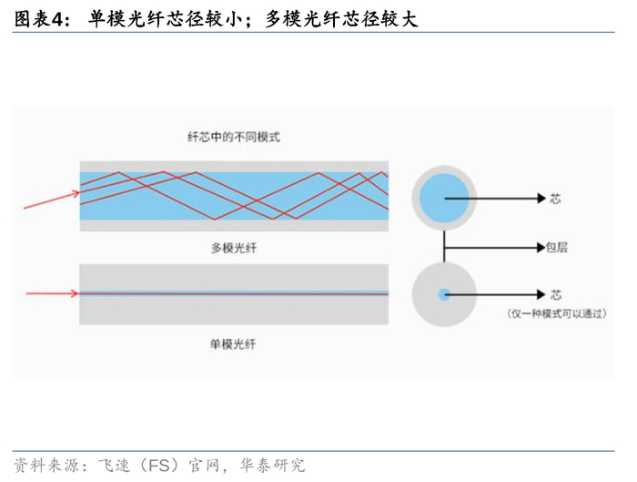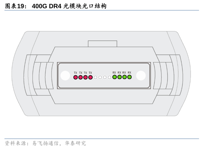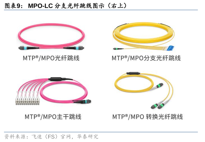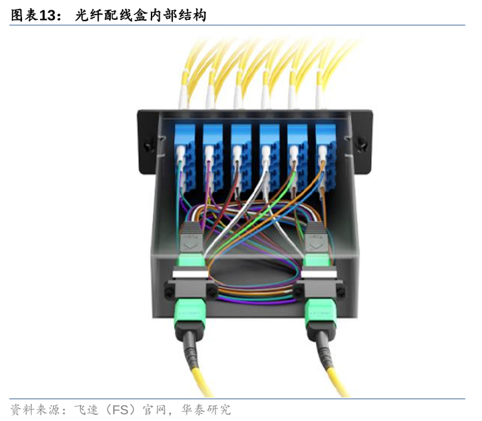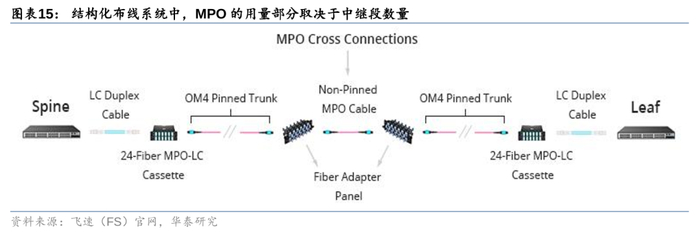 单模FR型光模块也会带动MPO连接器需求。如上文所述,以400G FR4光模块为例,由于采用了波分传输方案,光模块侧接口采用LC,故市场担忧该型号光模块不会带动MPO需求的提升。但我们认为数据中心基于结构化布线系统,通信网络通过汇聚层提供多条连接方案,也会形成对MPO需求的显著拉动。例如对于400G FR4光模块配套的光纤连接器而言,在数据中心中则多采用MPO分支光纤跳线(又称扇出光纤跳线),该类型的跳线一端配备8/12/16/24个双工LC/FC等连接头,与400G FR4光模块组合使用;另一端则配备MPO连接头,与光纤配线箱/配线盒等组合使用,形成汇聚,以节省布线空间。