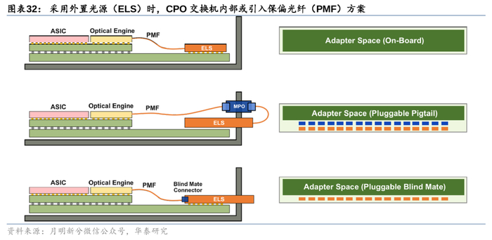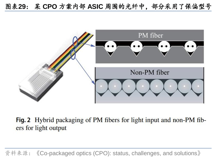 CPO交换机内部的MPO有望采用保偏光纤型号。由于CPO内部的光引擎通常采用硅光方案,而硅光波导对输入光具有偏振敏感性,不同偏振态的耦合损耗有所不同,所以当CPO采用外置光源方案时,内部光纤连接器有望引入保偏光纤的使用,使得光在光纤中仅沿着一个偏振方向传播,以保证光信号传输的稳定性。由于保偏光纤相较于常规光纤成本显著提升,故出于成本考虑,可以光纤连接器中部分光纤选用保偏光纤,其余光纤继续采用常规光纤。根据论文《Co‑packaged optics (CPO): status, challenges, and solutions》(2023/3),某典型CPO交换机内部,交换ASIC周围的上百/千根光纤中,一部分采用了保偏型号,用来做光信号的导入;另一部分则采用了非保偏型号,用来做光信号的导出。