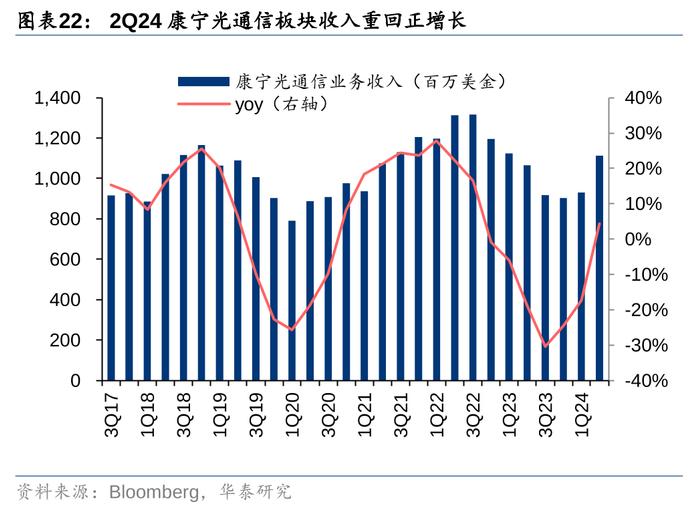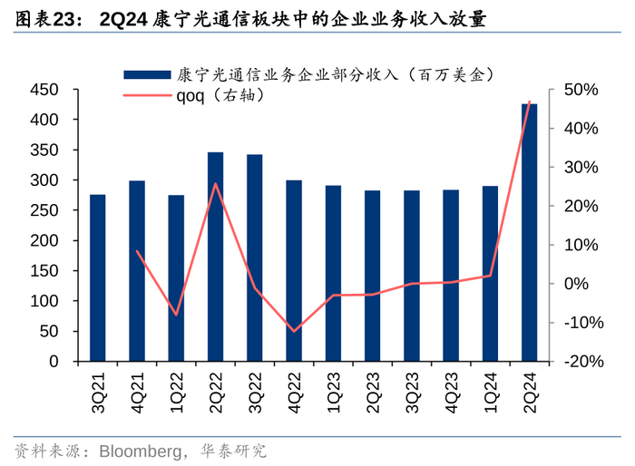 行业景气度观察:2Q24康宁光通信板块收入同比增速转正,其中企业业务同比高增长。2024年7月8日,康宁公司宣布上调2Q24核心收入指引至36亿美金,高于此前于1Q24业绩会披露中的34亿美金指引。康宁董事长兼CEO Wendell Weeks表示,背后的主要驱动力在于AI领域需求的快速起量。根据康宁2Q24财报,其光通信板块单二季度收入同比增长4%,时隔6个季度重回正增长,其中企业(包含数通)业务单二季度收入同比高增42%至4.3亿美金,创历史新高,并指引未来几年CAGR达25%。