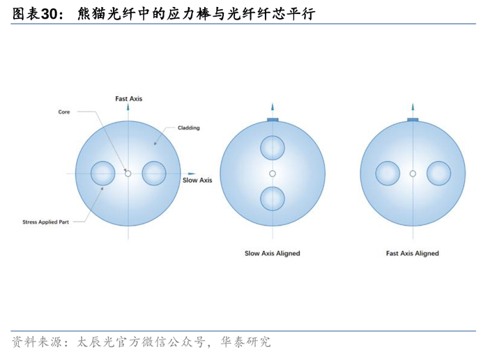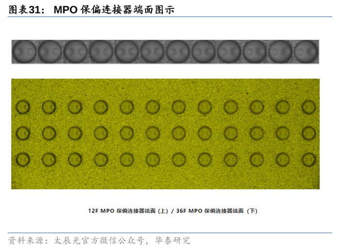保偏MPO技术壁垒进一步提高。根据太辰光官方微信公众号,保偏连接器中最常见的是“熊猫光纤”类型的保偏光纤连接器。熊猫光纤中的应力棒与光纤纤芯平行,施加的应力使光纤纤芯内发生双折射效应,在光纤中传输的光沿一个偏振方向传播。保偏光纤保持偏振态的情况好坏与偏振光的入射状态有关,要保持以好的偏振态传播就要求偏振光的偏振态与保偏光纤的快轴和慢轴方向耦合对准。要保证两根光纤以较高的消光比传输,就要保证保偏光纤通过光纤连接器端接时应力棒与连接器Key键对齐,这直接决定了保偏连接器传输性能的好坏。相比于单芯保偏光纤连接器,多芯保偏光纤连接器需要保证同一个MT插芯上的所有通道能够同时高质量耦合对准,技术难度更高,对工艺水平的要求也更高。