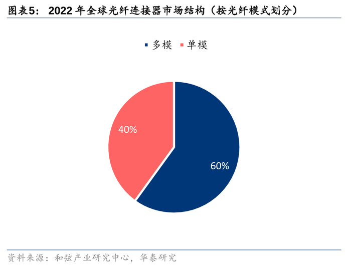 根据光纤类型的不同,光纤连接器又可分为单模与多模两种品类。根据所用光纤品类的不同,光纤连接器又可分为单模光纤连接器与多模光纤连接器两类。单模光纤具有较小核心直径(例如9微米),光信号以单一模式沿着光纤传输;而多模光纤核心直径较大(通常为50或62.5微米),可在给定的光频率和偏振情况下支持多模式传导。由于单模光纤和多模光纤支持光的传输模式不同,因此它们的应用范围也不同。单模光纤连接器由于具备较小的芯径与单一的传输模式,主要用于长距离、高带宽应用,而多模光纤连接器主要用于较短距离的传输。根据和弦产业研究中心统计,2022年全球光纤连接器市场中,多模与单模光纤连接器的出货金额分别占比约60%、40%。