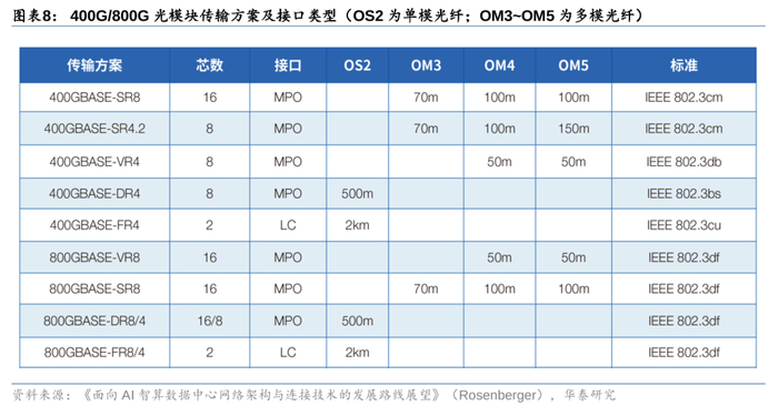 光模块接口类型适配不同传输需求,MPO不仅仅应用于多模光模块。光模块按照传输模式可分为并行和波分两种类型,其中并行方案在短距和中距传输场景中成本优势较为明显,采用MPO接口;而在长距离传输场景中,波分方案可较为明显地节约光纤成本,因此更为常用,采用LC/SC等接口。根据解决方案厂商Rosenberger(罗森伯格)于2024年5月发布的白皮书《面向AI智算数据中心网络架构与连接技术的发展路线展望》,以800G光模块为例,多模的SR8与单模的DR4、DR8型号均采用MPO接口;单模的FR4、FR8型号则采用LC接口。从以上我们可以看出,光模块是否采用MPO接口,主要取决于采用并行方案还是波分方案,而非单模与多模,例如单模的DR型号同样会采用MPO接口。